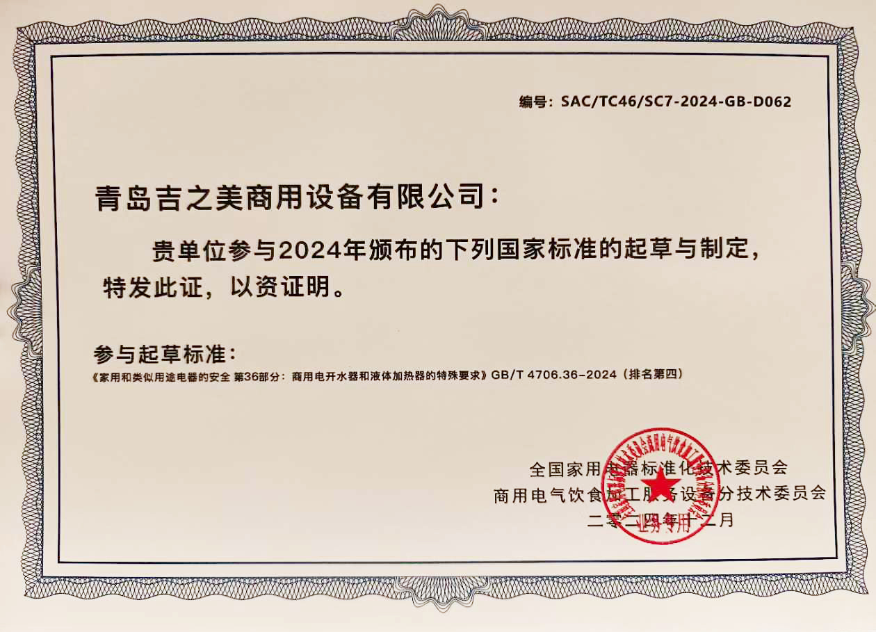 近日,青岛吉之美商用设备有限公司再次以其卓越的企业实力赢得了广泛赞誉——公司正式收到了由全国家用电器标准化技术委员会颁发的国家标准起草制定认证证书。公司成功参与了2024年颁布的国家标准《家用和类似用...