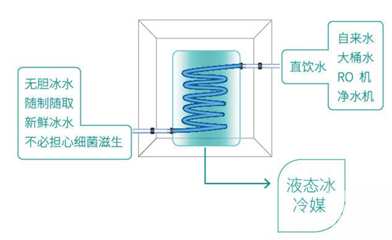 吉之美引用先进的冰蓄冷技术,利用相变储能原理对冷量进行储存,无胆瞬冷技术使饮用水通过热交换装置与低温介质水进行热交换,即使制取新鲜的饮用冰水。将原水进行双重净化处理后,还设有高效的UV杀菌装置,保障健康饮水的安全,从而实现可提供连续7升适温冰水的商务供水能力。